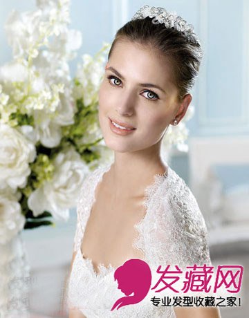 这样的新娘露额发型比较适合脸型较精致的新娘,梳理的整齐利落的造型,轻轻盘起,一个发饰足以,蕾丝婚纱,纯净自信的气质女人风范。