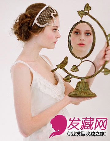 典雅的新娘盘发造型,卷卷的头发自然盘起来,配上棕色染发,甜美吸睛,独特的发网头饰,凸显圆脸美妞的恬静气质。