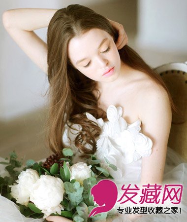 这款披肩的简单长卷发是很适合长发MM打理的一款新娘长发发型,中分发型设计露出额头清爽优雅,简单打理就很有女神范儿。