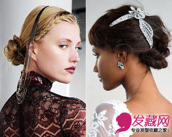 无论是沿发迹线的编发和低发髻的组合,还是复杂的鱼尾辫状高发髻,都像是头上优雅的花朵在盛开着,华丽的披链和满钻的花朵头箍做装饰,实在是最大的看头。