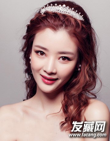 科研的编发发型,清爽的露额发型加上时尚的红棕色发色点缀上头饰后勾勒出无比的时尚感来,而且气质的中长卷发搭配上个性的小卷十分有气质。
