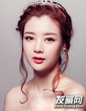 这一款气质的低发髻盘发加上甜美的刘海编发显露出无比的时尚感来, 两侧边的鬓发勾勒出别至的时尚感来,而且红棕色发色自然显肤白, 搭配上皇冠优雅端庄。