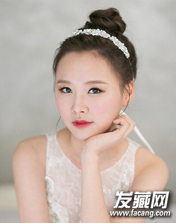 发型点评:高耸的丸子头展现出清爽利落的气质,前额的刘海用水晶发箍全部固定起来,露出白净的额头,展现出清新的浪漫感。