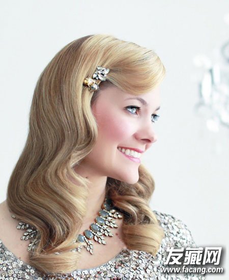 如果你的婚纱是比较具有复古感的长裙,那你一定要试试这种华丽的复古卷发,它就是手推波浪卷(Finger Wave Hair),它的S形波浪并不是靠卷发棒等加热工具,而是靠发型师的手指和梳子。早在1920年,这款发型就曾风靡一时,当时爱美的名媛少妇都去美发沙龙追赶这个发型潮流。