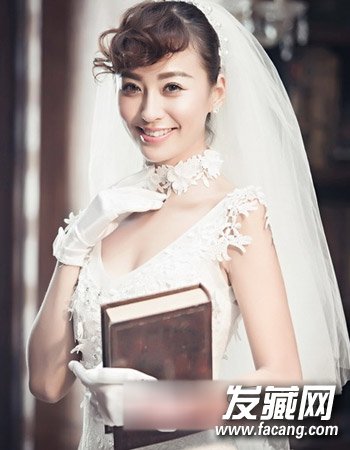 盘发与头纱的搭配,不仅优雅而且时尚,烫发刘海形成蓬松的卷发造型来,不仅时尚而且优雅有气质感,搭配上长长的头纱优雅且时尚。