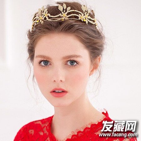 点评:时尚的染发进行盘发,再将头发打造出蓬松的效果,修颜减龄两不误哦,搭配金色的发饰更高贵,加上蕾丝镂空的婚纱,浪漫之余有很好凸显出女人的性感美!