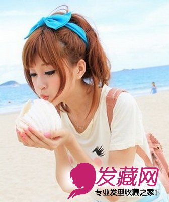 在刘海两侧留下特别长的两缕头发,顺着脸颊的弧度下垂,发丝的微微弯曲的形状紧贴着脸部,正好能够修饰着女生的圆脸,可爱的马尾辫和蓝色的蝴蝶结发带将女孩单纯可爱感衬托出来,女生散发着大海阳光的气息。