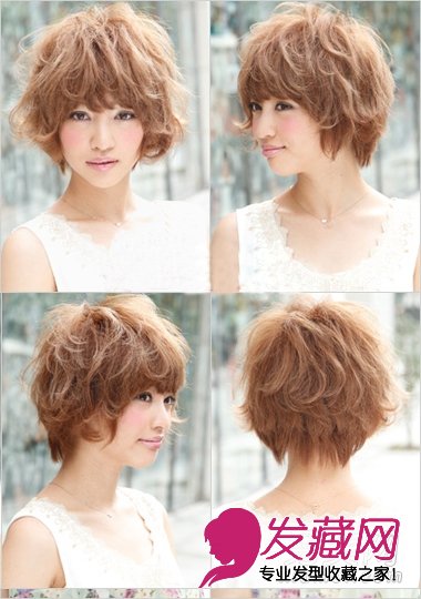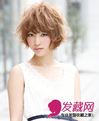 头发满布卷发丝的短发造型,以扩大体积的作用将脸型从视觉上减小。整个以轻轻的凌乱和伞形的设计,令椭圆脸型变小巧,配搭又卷又长的刘海,制造钻石小脸蛋。