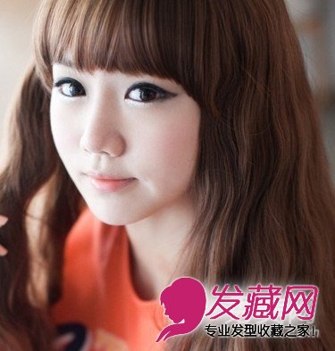 齐刘海搭配蓬松的造型修饰出娇小脸庞,搭配棕色染发造型时尚。