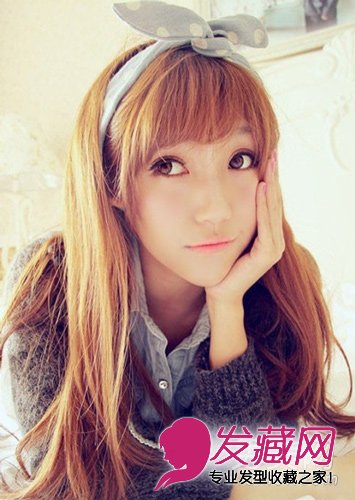 小编点评:长卷发+棕色染发,不规则的齐刘海,两侧留出的发丝,很好的修饰了脸型,缩小两颊的肉肉,浪漫的自然卷,可爱的蝴蝶结发箍,给整个发型增添很多唯美的气息。