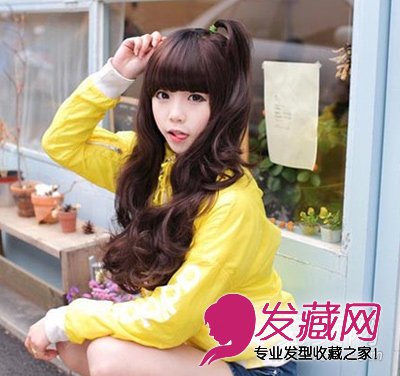 小编点评:齐刘海卷发+棕色染发,棕色系的染发非常的百搭,在头顶扎起的小辫,可爱十足。齐刘海和长卷发非常的修颜。