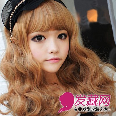 小编点评:金色的齐刘海波浪卷发,就如芭比娃娃一样甜美可爱,齐刘海和蓬松的卷发,可以将圆脸遮成小V脸。