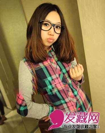 嘟嘟的小嘴萌味十足,黑色系的眼镜框显个性搞怪,中分的直发梨花头,自然优雅,搭配格子衬衫学生气息尽显。