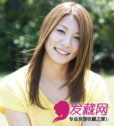 阳光的笑容十分迷人,侧分的中长直发,清新纯净又瘦脸,亚麻色的染发亮丽时尚更能凸显白皙皮肤。