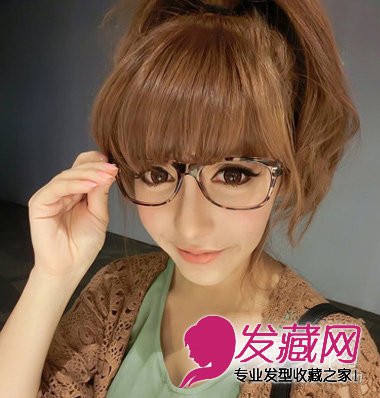 单发型,时尚活力的马尾,青春可爱,动感活泼,齐刘海的发型设计,瞬间瘦脸减龄,浅亚麻色的染发,呈现出青春洋溢少女味。佩戴豹纹眼镜框个性搞怪。
