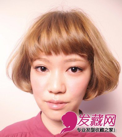 个性的齐刘海加上剪的偏短的短发,内扣式的烫发突显了个性,也修饰了脸型。