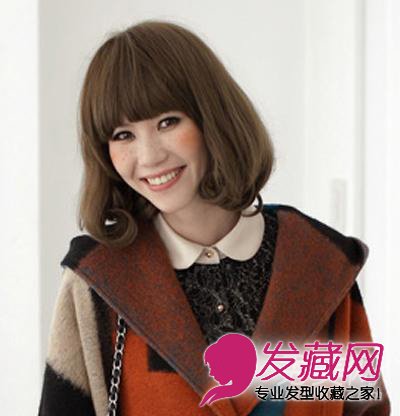 齐刘海绝对是许多萌系女生们的最爱,配上精致迷人的大眼妆更是吸人眼球,将齐肩的中短发发尾烫上甜美的梨花大卷,更是为你加分不少。