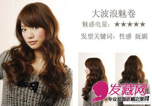 这款大波浪的长卷发妩媚动人之极,大波浪的优美弧度最能修饰出小脸效果,超过眉毛的侧分斜刘海巧妙遮住过宽的额头,是圆脸、大脸、长脸的最佳选择。