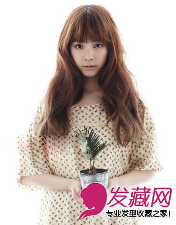 怎么显瘦,萌系的齐刘海修饰了长脸,灵动的长卷发制造出的波浪卷度遮了两颊的肉肉,柔和感的亚麻棕色使得少女更加可人。
