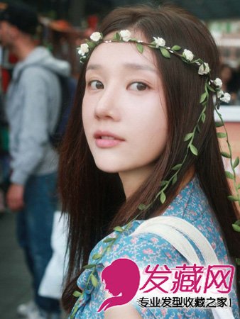 依旧是中分的发型,的确,中分的发型是最适合圆脸的显瘦发型。配上花环很有田园风呢。
