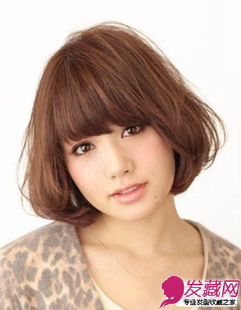 齐眼睑的刘海微微内扣,加上打造蓬松的卷发绝对是瘦脸的最佳组合,棕色的短发带点凌乱的美感,看起来更加甜美可爱。