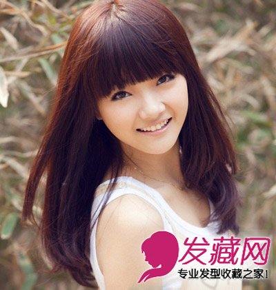 发尾向内扣的中长发,灵动甜美又显乖巧,整齐的厚刘海既可爱又 能修饰肉肉脸型,板栗色的染发凸显了红润白皙的皮肤同时又不失时尚感。