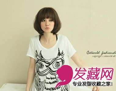 这款简单的短发,厚重的平刘海与蓬松的头发,可以增强发型的可视度,内扣的发尾很好的修饰圆脸,嘟着嘴更加可爱。