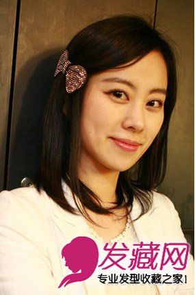 编辑点评:黑色侧分中长发自然健康,别上一只晶莹的蝴蝶结发夹,优雅知性。