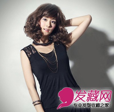 斜刘海的蓬松卷发,齐肩的设计,将卷发发尾置于脖子处,不规则的卷发修饰了肉嘟嘟的圆脸。