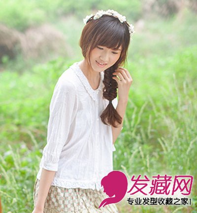 松散的蜈蚣辫编发,稀少的刘海,脸颊两旁留下来的发尾有点向内卷使得它和脸形有点距离的两缕头发让她的脸形看上去显得非常的可爱。