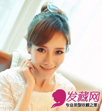 凉爽的花苞头扎发,棕色的秀发突显女生时尚的气息,斜刘海给人清爽的感觉,配上蝴蝶发饰装扮更显出自然美!