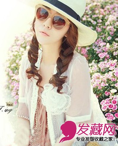 这也是一款麻花辫发型,将头发分成两股编成低位麻花辫,很有韩范儿的长发发型,搭配一个白色圆帽和褐色墨镜,显得十分俏丽时尚。露出圆脸也不显胖。