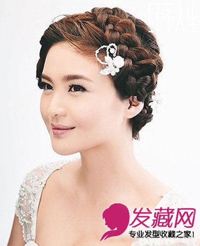这款唯美的盘发发型看似有些复杂其实是很简单的。先将头发梳顺,分别编两至三根麻花辫,再将编好的麻花辫向一侧混合,用发饰固定好就可以了。露出完美的五官,即使圆脸也很有气质了。