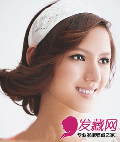 这款很有特色的盘发个性十足呢!层层波浪向后反卷,展现出公主般的俏丽甜美,再搭配白色宽发带,显得华丽而又端庄。斜刘海很少,露出额头拉长圆脸脸型,使脸变得更加细长了。