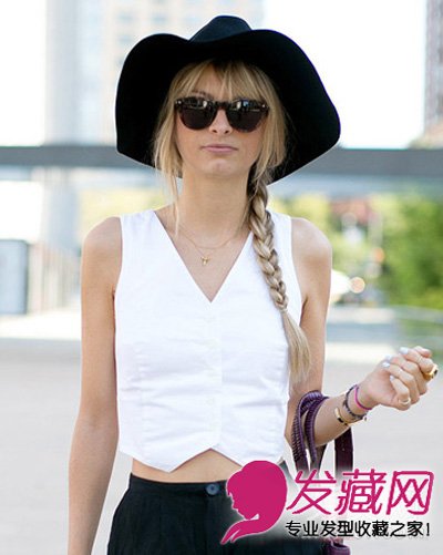 这款侧扎马尾前面留了很多凌乱松散的发丝,正好可以轻松遮住脸型不完美的地方,很适合圆脸美眉哦!从头到腿,一身黑白色显得更加时尚干练。