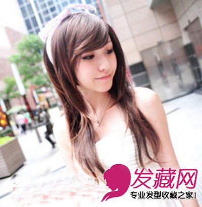 这款斜刘海女生长发,两侧的发丝有层次感的修剪,为整款发型增添了时尚的魅力,斜刘海的发型设计,修饰了女生过圆的脸型,使得脸型显得娇小可爱。