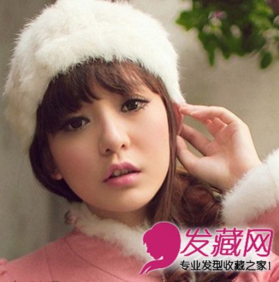 白色绒帽的融入,让浓烈的2013冬季气息更加逼人了,侧马尾扎发的发型,让地道的女人味尽显,薄碎的齐刘海增添一份柔和感,宽松的斜低马尾完美修饰了圆脸,十分甜美。