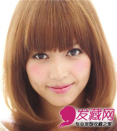 整齐的刘海在额头上画出一字型线条,冲淡了圆形脸颊带来的圆润感。脸颊两侧的秀发柔顺光滑,在肩头呈现出一个内扣的线条,显得甜美又可人。再加上明亮的金棕色染发,打造出时尚芭比的味道。