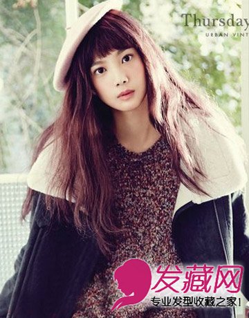 披肩的直发发型,蓬松感感十足,剪个齐刘海,大额头,肉肉脸统统拜拜,自然的深色染发颜色,散发纯真少女味道。