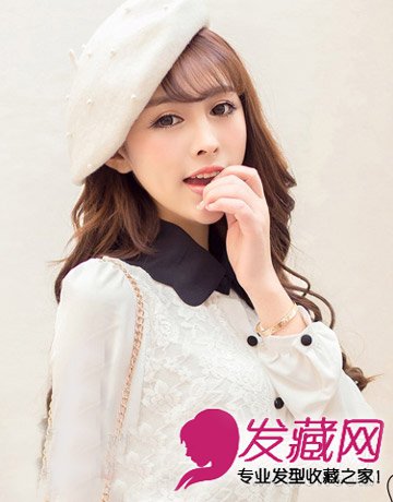 螺旋烫卷发发型随型披散在肩上,无比的优雅浪漫,营造出了动人的美态,齐刘海再加上一顶贝雷帽,凸显出一张精致的脸庞,美丽动人。