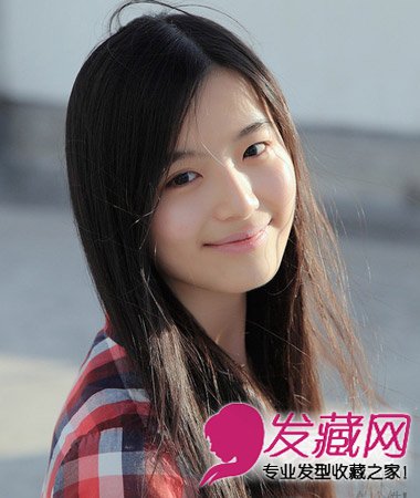 小清新范儿中分露额长直发发型,乌黑的浓密发丝顺直飘逸的长发清新柔美,很有校园系MM的清纯感。