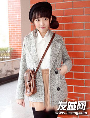 圆脸女孩也可以利用侧扎发来修饰脸型,侧边挽起来发髻,可爱又瘦脸,搭配小礼帽,毛呢大衣,凸显文艺范女孩风采。
