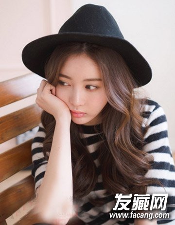 蓬松的韩式大长卷发不仅妩媚动人而且颇具个性潮流范,气质的中分卷发很好的将圆脸勾勒出气质感来,黑色礼帽是点睛之笔。