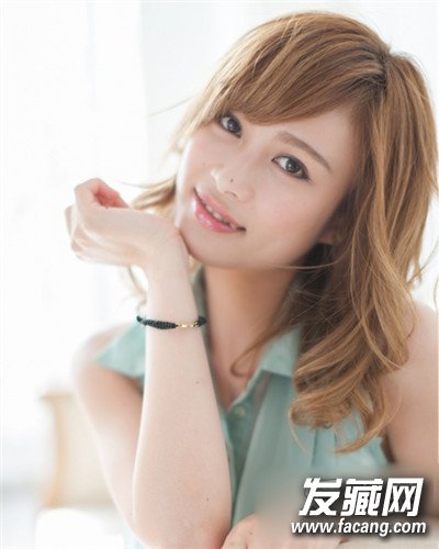 圆脸女生中长发可以选择这款斜刘海的烫发发型,刘海是有一定的张弧度的,现边的砂发卷曲得很恰恰当地修颜。