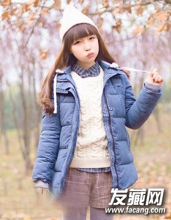 一款时尚的长发烫发,发尾的小卷勾勒出别致的时尚感来,齐刘海与帽子的搭配也是圆脸发型的首选。