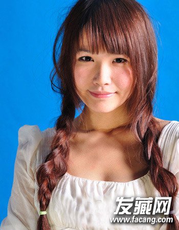 一款很是清新淑女风式的时尚圆脸女生适合的刘海发型设计,利用的是微显凌乱感的齐刘海造型设计,再配合棕红色的当要与简单的长发双马尾辫编发修颜更添小女生的温柔淑女风。