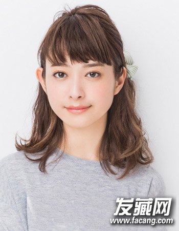 微显凌乱感的齐刘海造型设计再配合低调的褐色染发造型同样很显女生的清新时尚感,而半扎式的齐肩卷发设计与齐刘海相搭,简单修颜更添女生的温柔公主范儿。