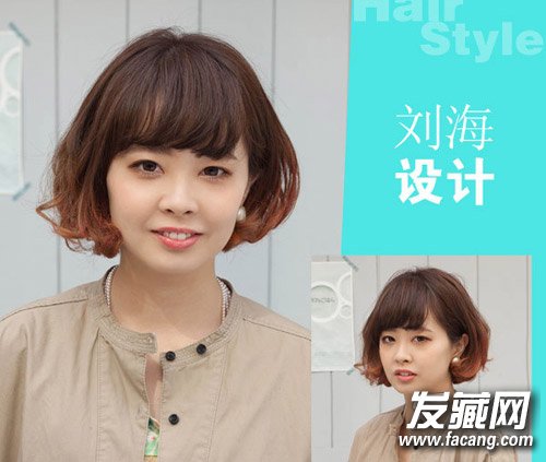 这款波波头卷发的刘海设计是蓬松微弯的齐刘海。一侧太阳穴的头发塞到耳后,露出一点点额头和完整的侧脸。弯弯的齐刘海和蓬松的卷发既瘦脸又cute。