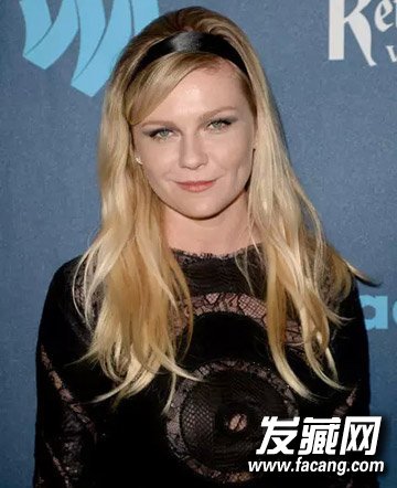 增加顶部头发的高度,突出纵长的轮廓,是适合圆形脸的发型。比如Kirsten Dunst的复古发型就是一个很好的示范,头顶靠后的位置梳出一定高度,搭配发带,在视觉上拉长脸部轮廓。还有一个简单的方法,在你习惯分法的另一侧,将头发深侧分,这样做能让发根坚挺,无形中拉长脸部比例。