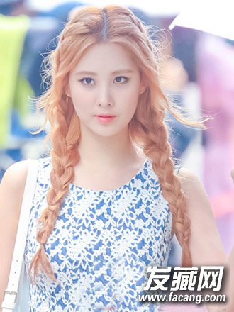 圆脸女生如何扎头发更显清新好看呢?这款橘色系的长发发型,简单的设计成中分的双边编发发型,打算配无袖的上衣,展现十足时尚潮女气质。